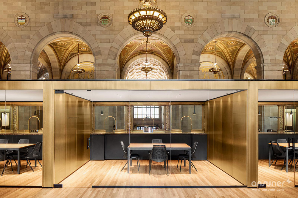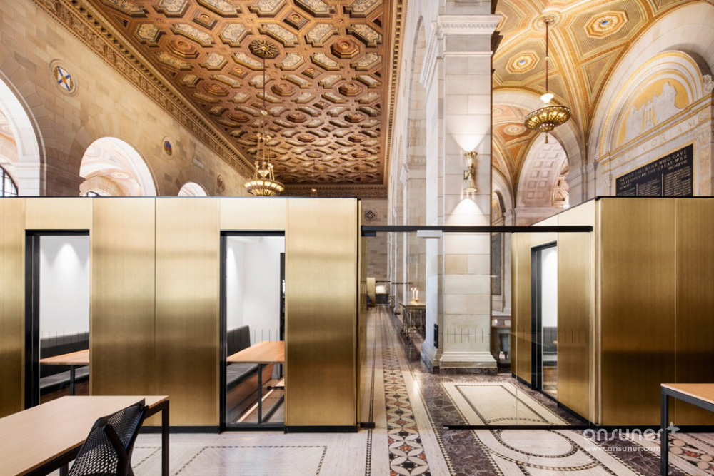 一字排开的会议室,内部隔断采用精美的拉丝镀铜钢板制作,以此与华丽的石膏天花构造形成对比和色彩上的统一。这里的会议室面向大众开放,任何人都可以预定使用。正面透明的玻璃设计可以随时观望会议室的使用状况。