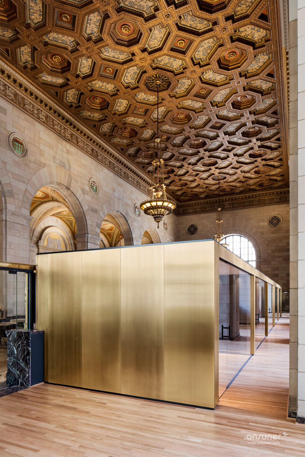 拉丝镀铜钢板构筑的小空间贯穿本案整个设计,与建筑原有的黄铜元素形成对话。新建的构造只是辅助配角,原来的建筑才是真正的主角。