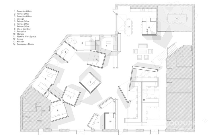 FreelandBuck最近完成了在洛杉矶的Hungry Man Productions总部设计。当被要求重新考虑办公室的组织时,设计师将员工的身份的轻松与一系列颠倒的隔间相匹配 ,这些隔间有趣地挑战了典型的办公空间的规律性。整个大型开放式办公区松散组织,非正式的安排创造了多样化的稳定和灵活的工作配置。此外,设计上充分利用 了仓库外壳的天花板高度,将箱体堆积起来,使视觉上突显和投影区域。在用cnc研磨的MDF的表面处理和涂上细节的表面处理这些翻滚的立方体。从特定的角度来看 ,这些铰接的表面创造了空间错觉和活跃、动态的工作氛围。