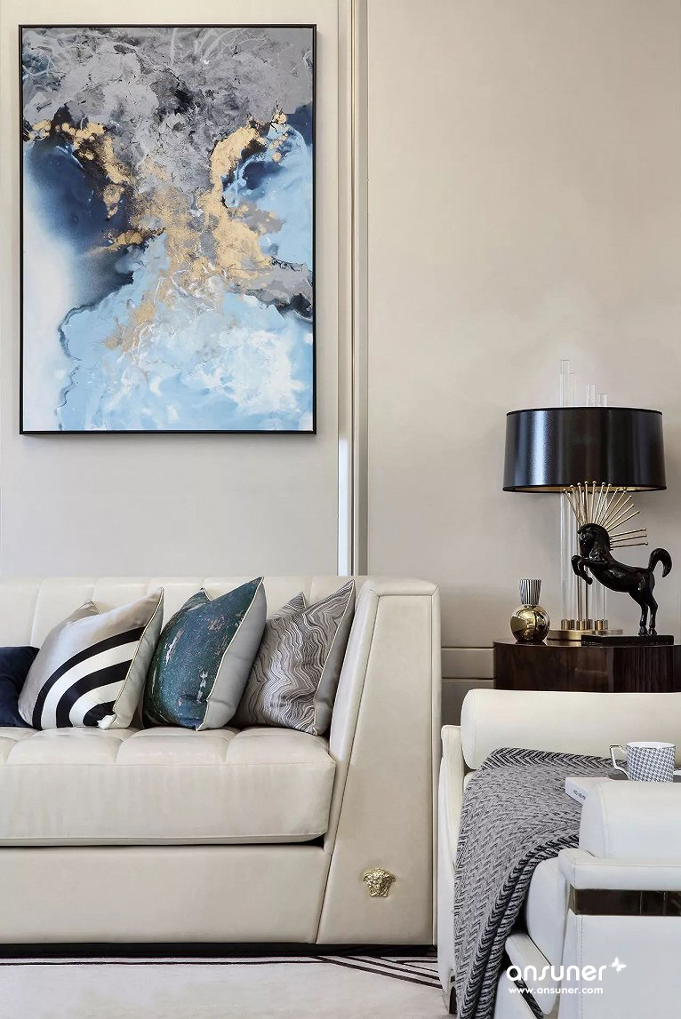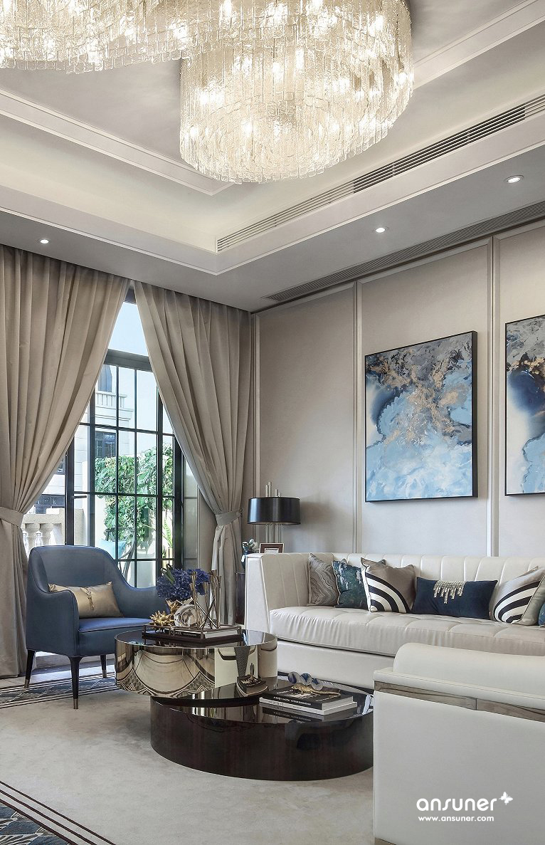 客厅整体空间为浅色系,线条简洁硬朗,象牙白的背景色,奠定了空间低调的质感、优雅的基调。设计师采用大量高级皮质材料,巧妙搭配自然质感的石材以及金属元素,璀璨的金色和几何经典,给予色彩最大的礼赞。流光溢彩的水晶吊灯尽显奢华,恰如一个浪漫的音符,赋予空间生动轻灵的魅力。