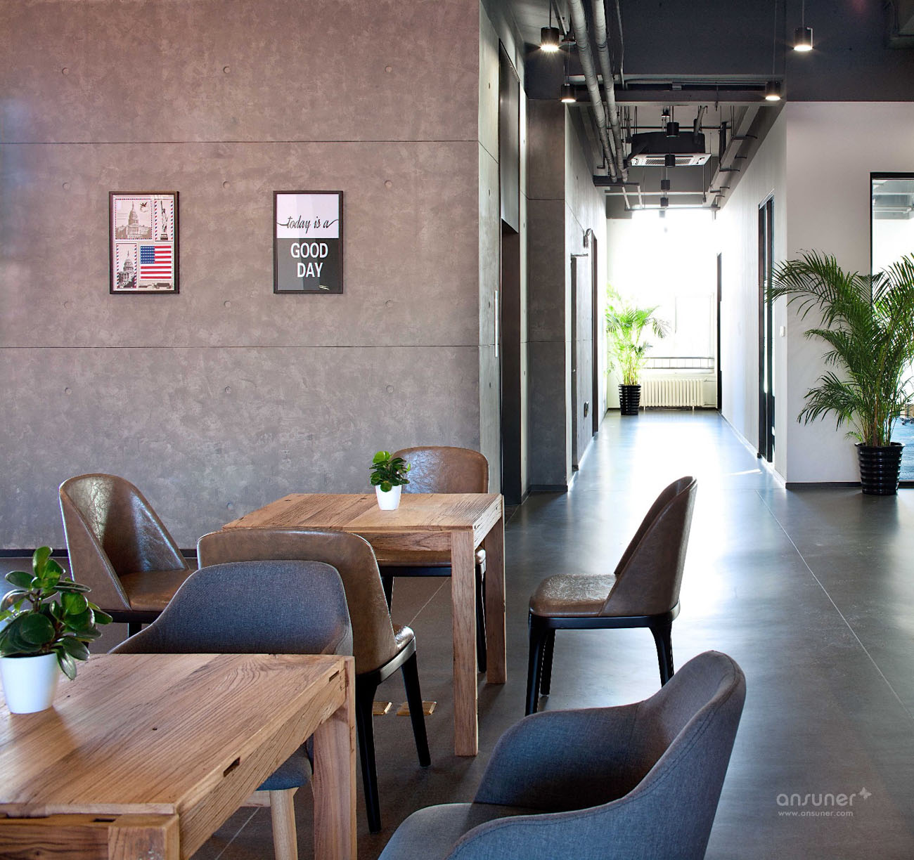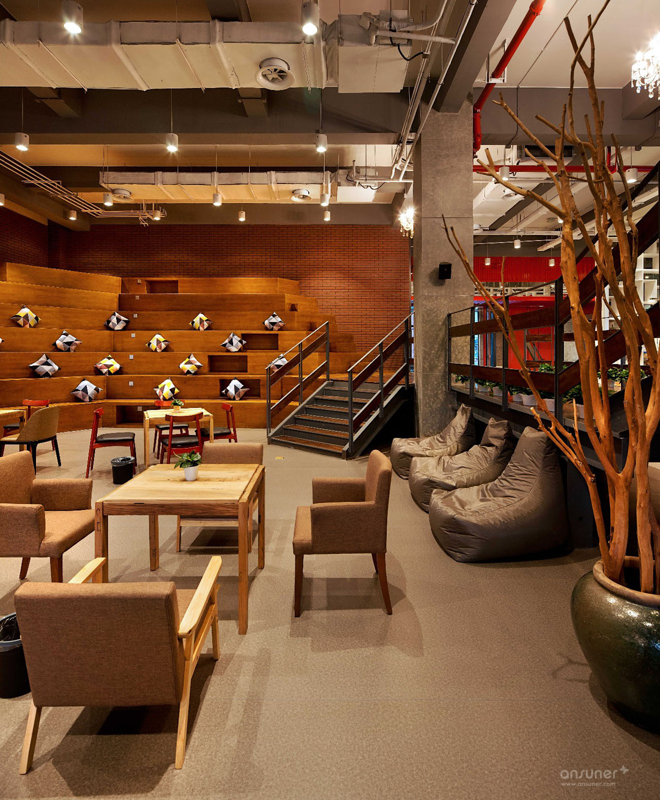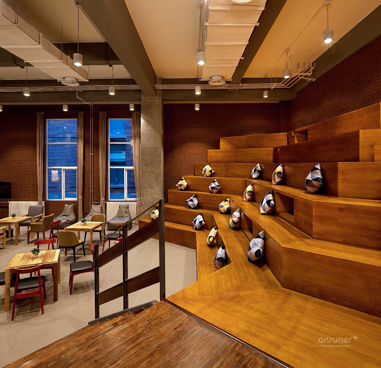 入口处醒目的大红色门厅,墙壁饰面采用集装箱纹理,与接待台后的木色饰面即形成了鲜明对比,同时又烘托出了温暖、开放的环境氛围,独特的工业风格特色让人第一眼就留下深刻印象。铁制的接待台经过特殊锈化处理,展现出了斑驳仿旧的视觉效果。