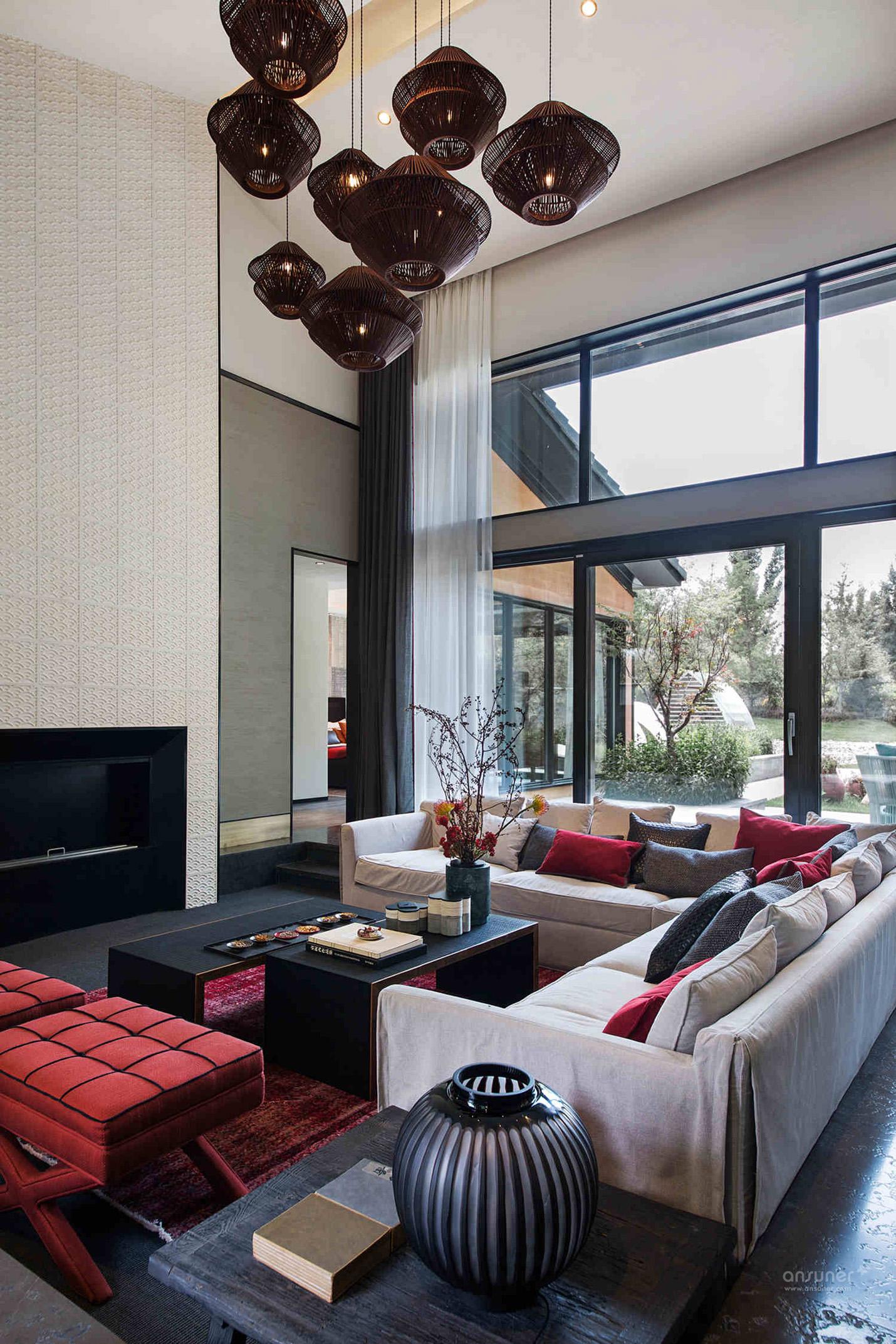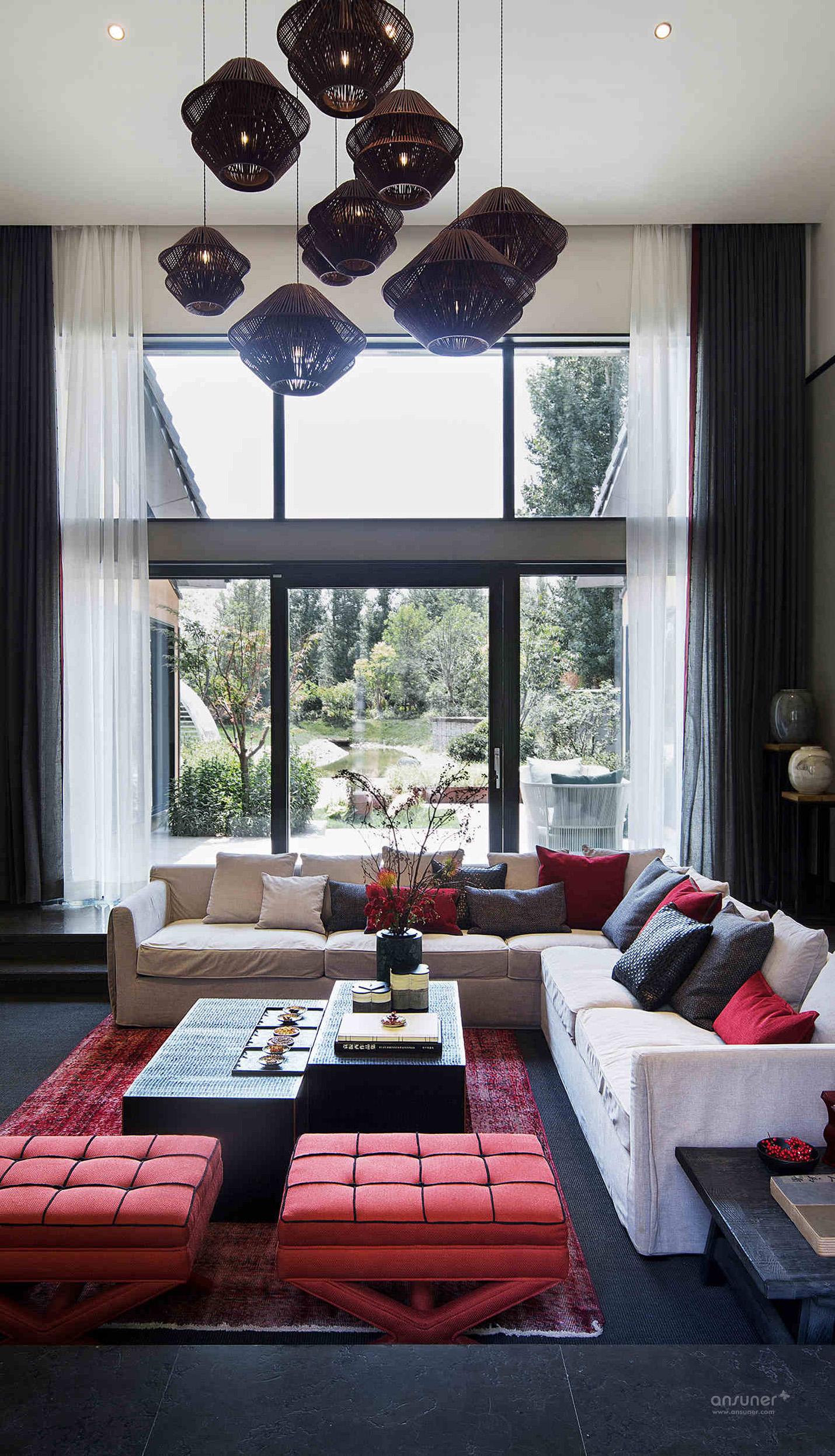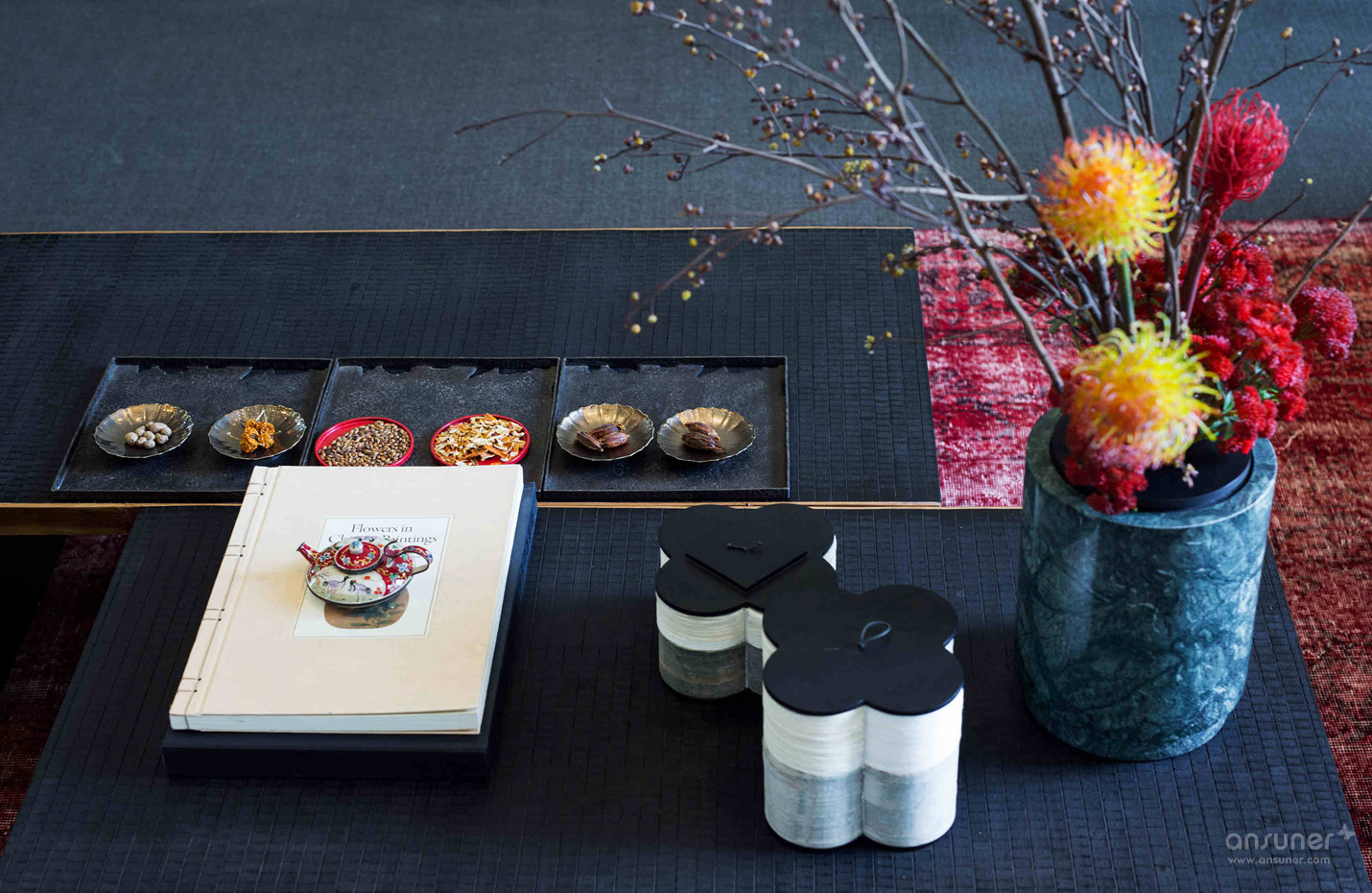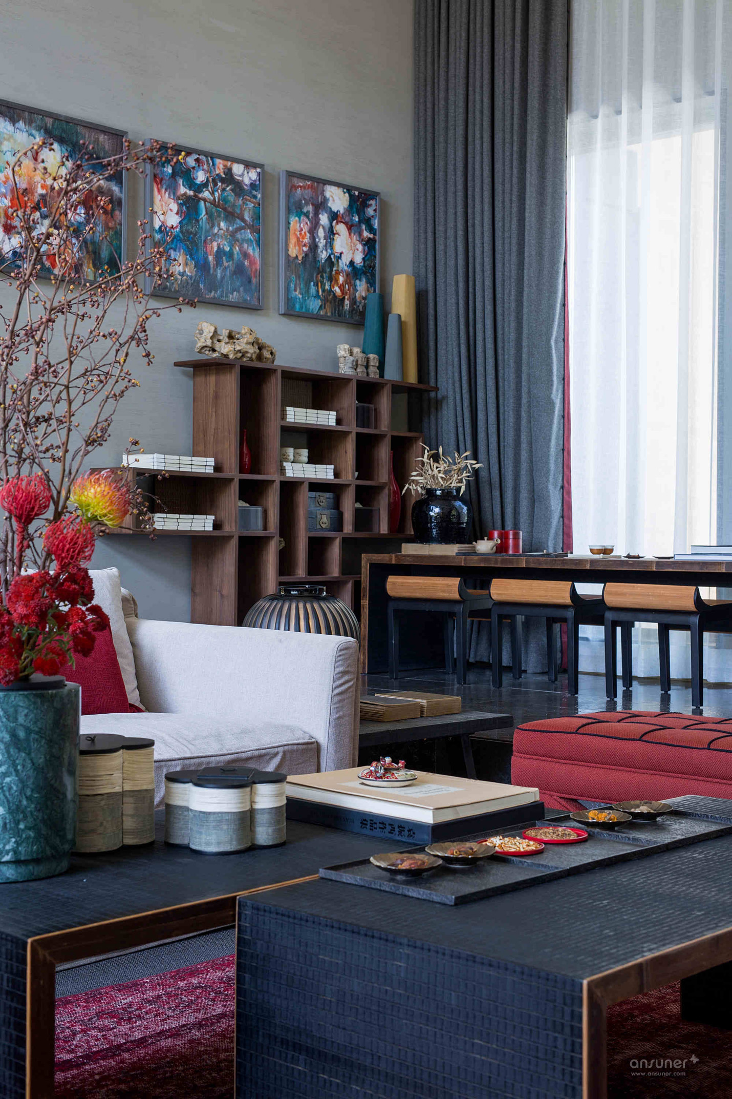 客厅:软装设计上,色彩浓重与用材粗放的矛盾组合,不拘一格,在隐藏的静室之下掺杂了强烈而又煽情的色彩视觉。细节处低调嵌入优雅的中国传统纹样,以打破重组的独特手法,在空间里造成恰当的碰撞,粗粝的花樽中,娇俏的花枝摇曳,明艳中还带有丝丝缕缕的纯真。