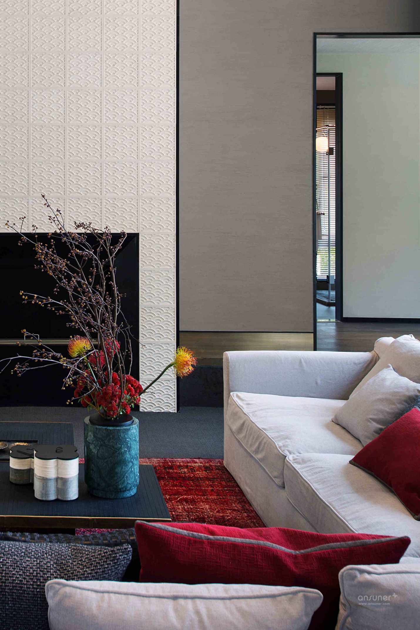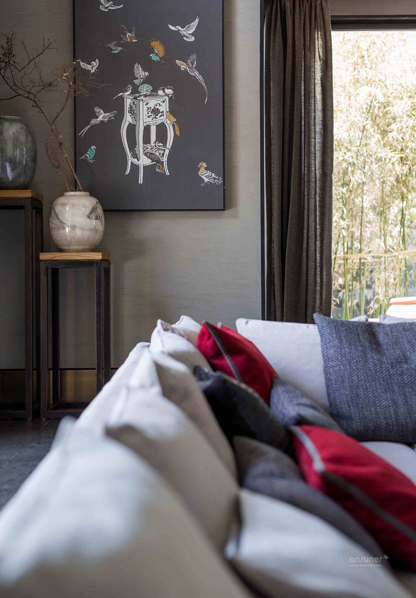 客厅:空间布局方正规整,用特别拘谨方整的艺术形式、刻线平整 、造型简单,以中国的“楷”,寻找中式艺术的“端正方整”,而粗犷的材质美把修饰降到最低,也回归到了最本质的自由。