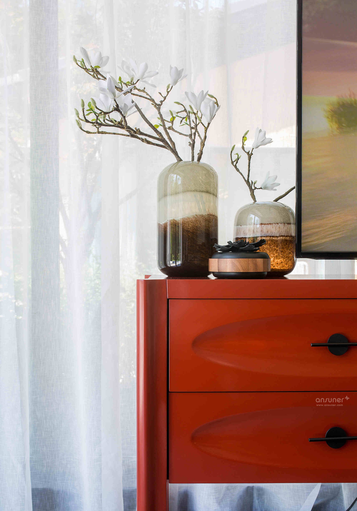 餐厅:餐厅延续了客厅的设计格调,捕获繁华绚烂中的一片宁静详和。青黑色的木桌、朱砂红的木制座椅、黑釉陶罐花樽,设计师运用意象叠加的手法,烘托出就餐区源自古老的韵味和踏实的生活情调。来自青年艺术家王志新的《花团锦簇》,极具张力的色彩与整个空间浑然一体。