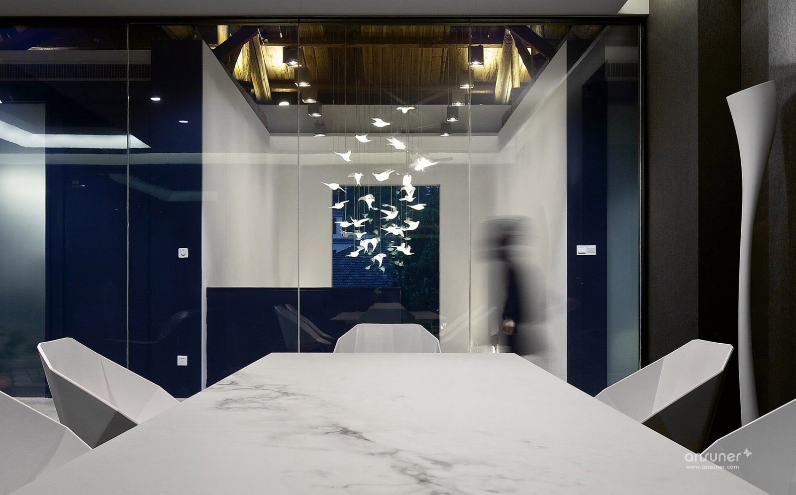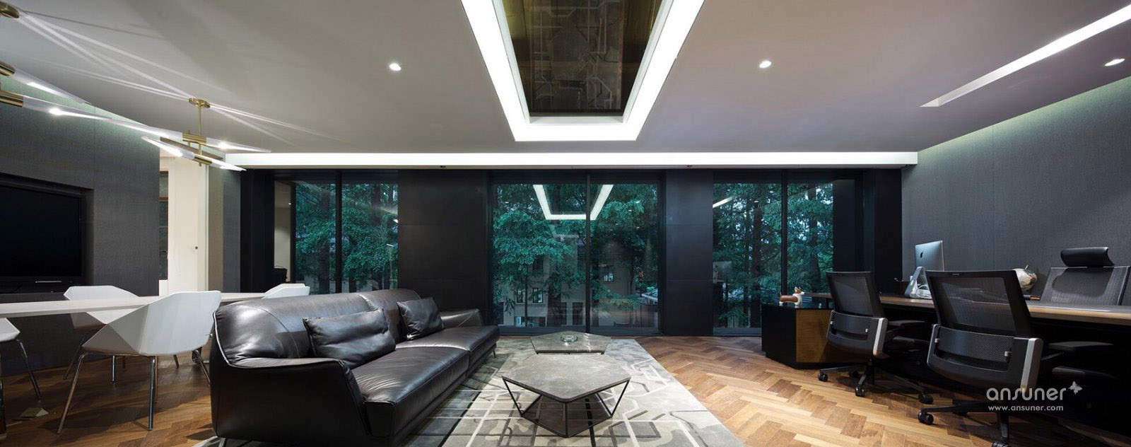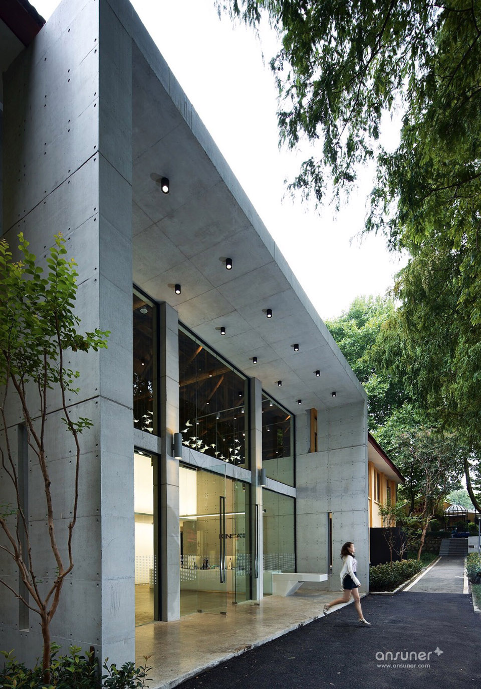 改造项目就是重新建立秩序的过程。在老空间置入微型建筑来重组空间,保持原有空间的质量,从整个建筑的外立面上置入三个空间口,主入口,咖啡厅入口,董事长办公室取景窗,重新组织建筑的空间秩序。为了强调主入口的等级,运用相对厚重的清水混凝土墙来强化。一层大堂挑空区域的材料,是像玉的润度的树脂装饰板,作为室内的主要墙面,组织主要交通空间,是连接一层各个功能空间的纽带。