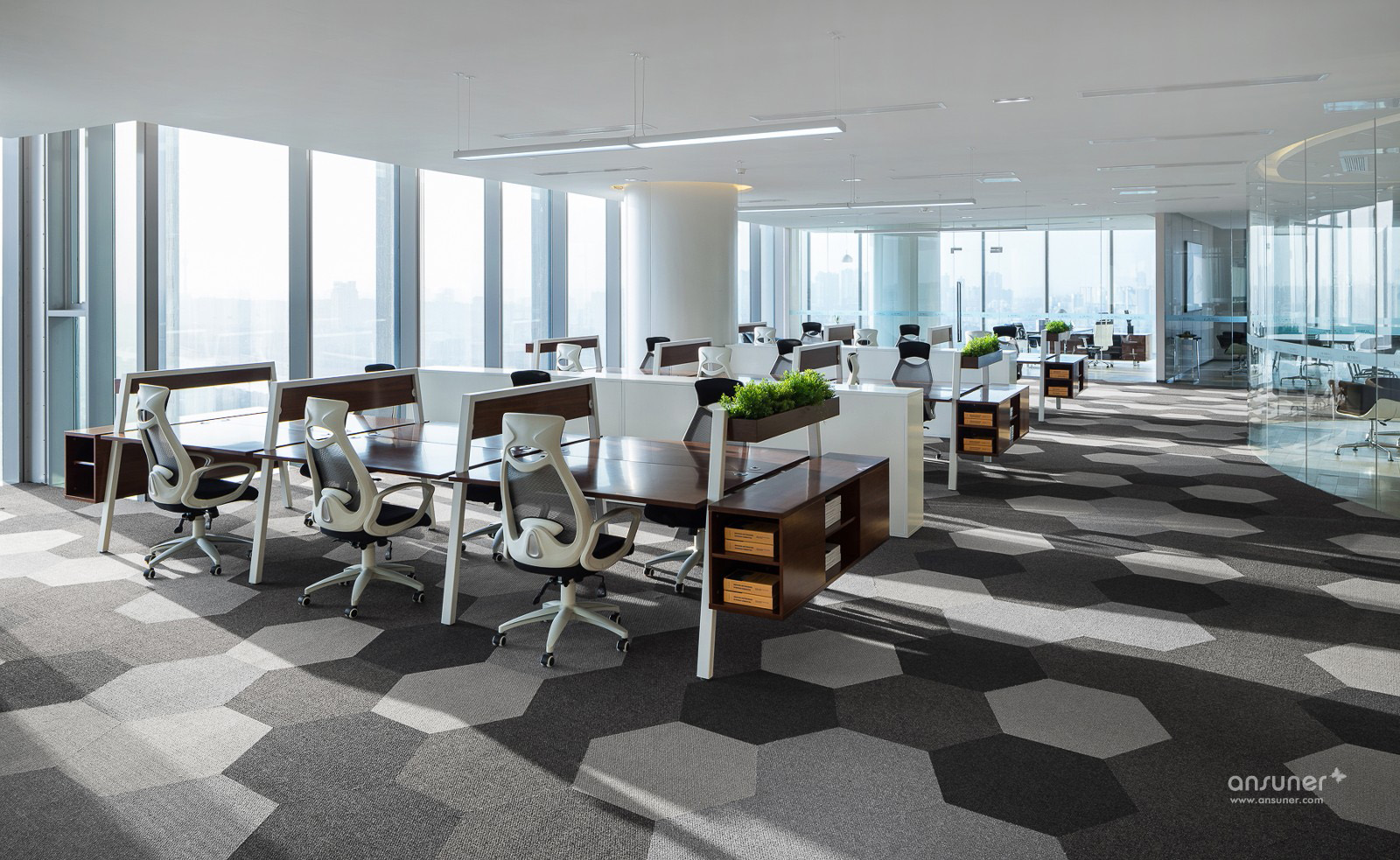 在偌大的办公区内,有一半墙面为落地窗,近见轻轨一号线蜿蜒向北,远眺龟山电视塔、长江大桥、黄鹤楼等,汉江十景,尽收眼底。故除布置了办公家具外,同时靠窗位也放置了形态各异的休闲椅,让上班族在工作之余可一览旖旎江景,放松身心。