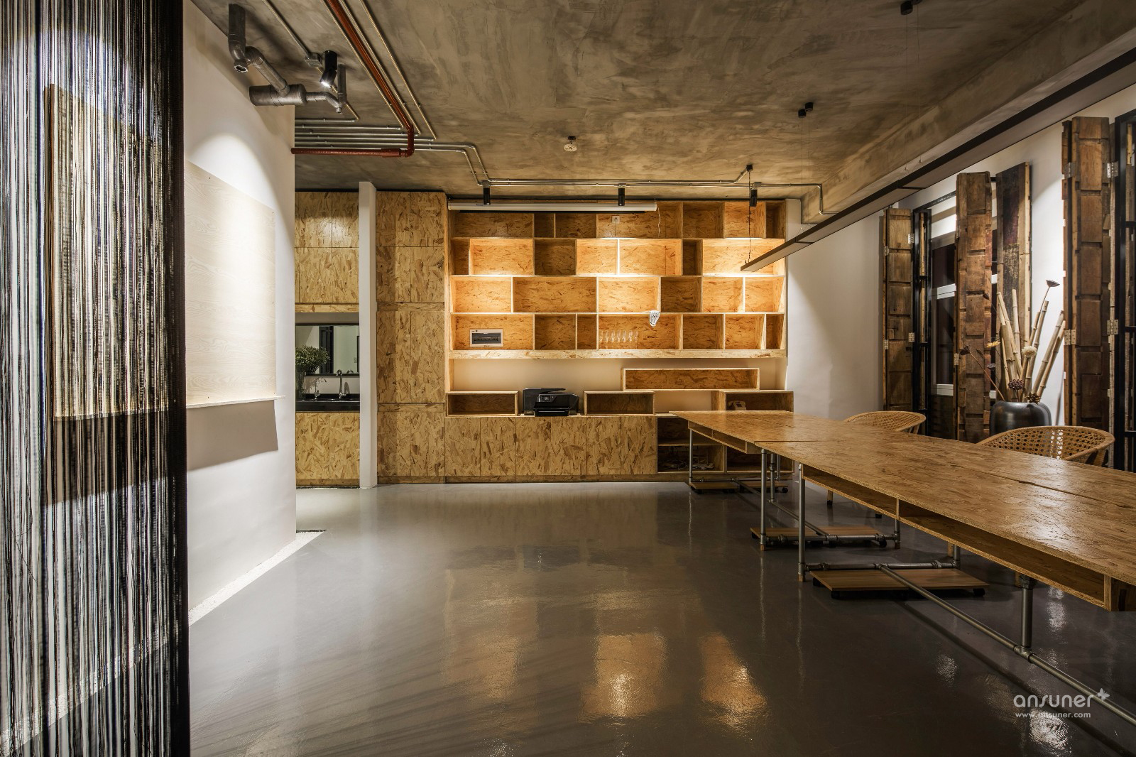 设计师通过保留清水水泥裸顶、消防管道,轻松的天花布线,以及大面积的原色欧松板,工业风直白的空间叙事,一起写下了设计本质的批注。