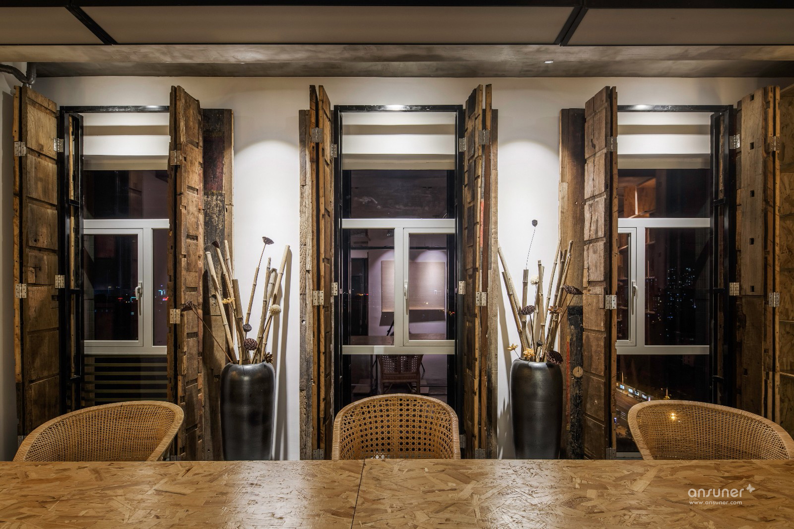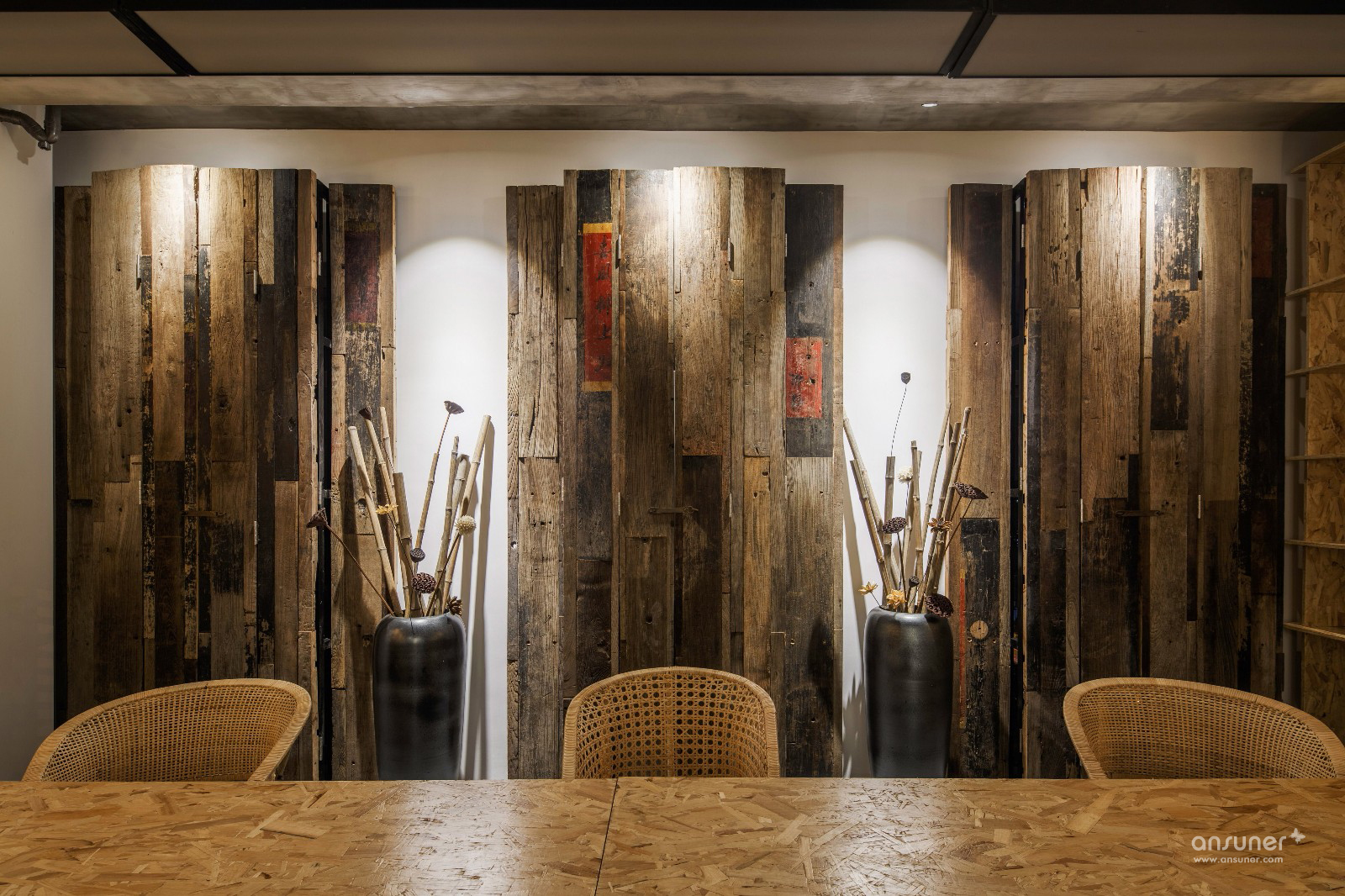 四扇落地窗将光线引入昏暗的走廊,竖向的线帘与横向的竹帘,细腻的思维和粗旷的手法,创造的重组与视觉冲击,最终达成和谐。进门后映入眼帘的老门板,从北京到长沙,传承了百年的文化经典。老门板余料拼成粗犷遒劲的木门;柔美雅致的流线型高柜,巧妙的围合出储物空间;设计师手工打造的办公桌纯粹且新颖。不寻常的空间让员工仿佛置身于老街古巷,使后现代风格也透露出历史的温暖,满足了人们在其中一切关于过去的美好幻想。