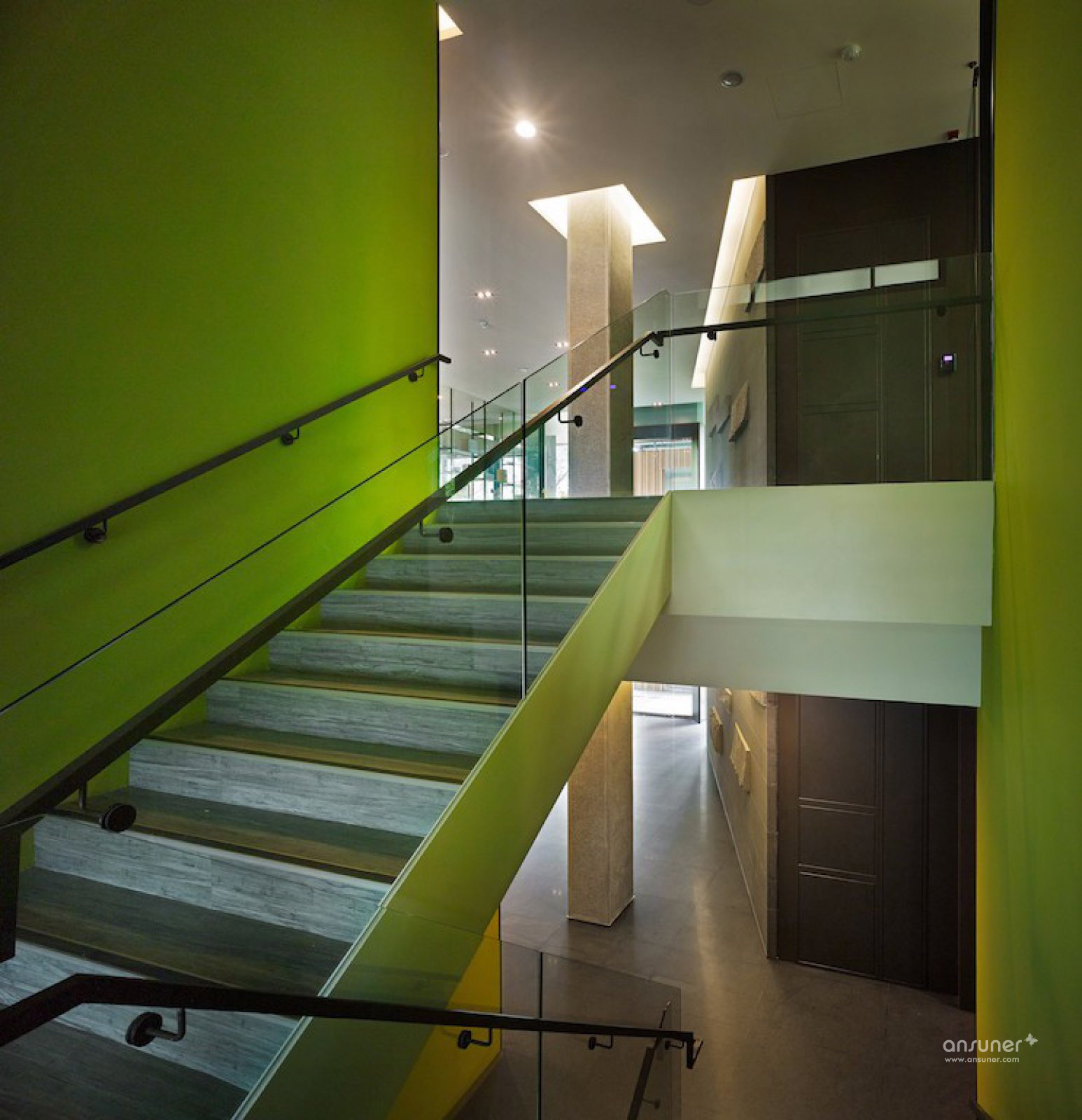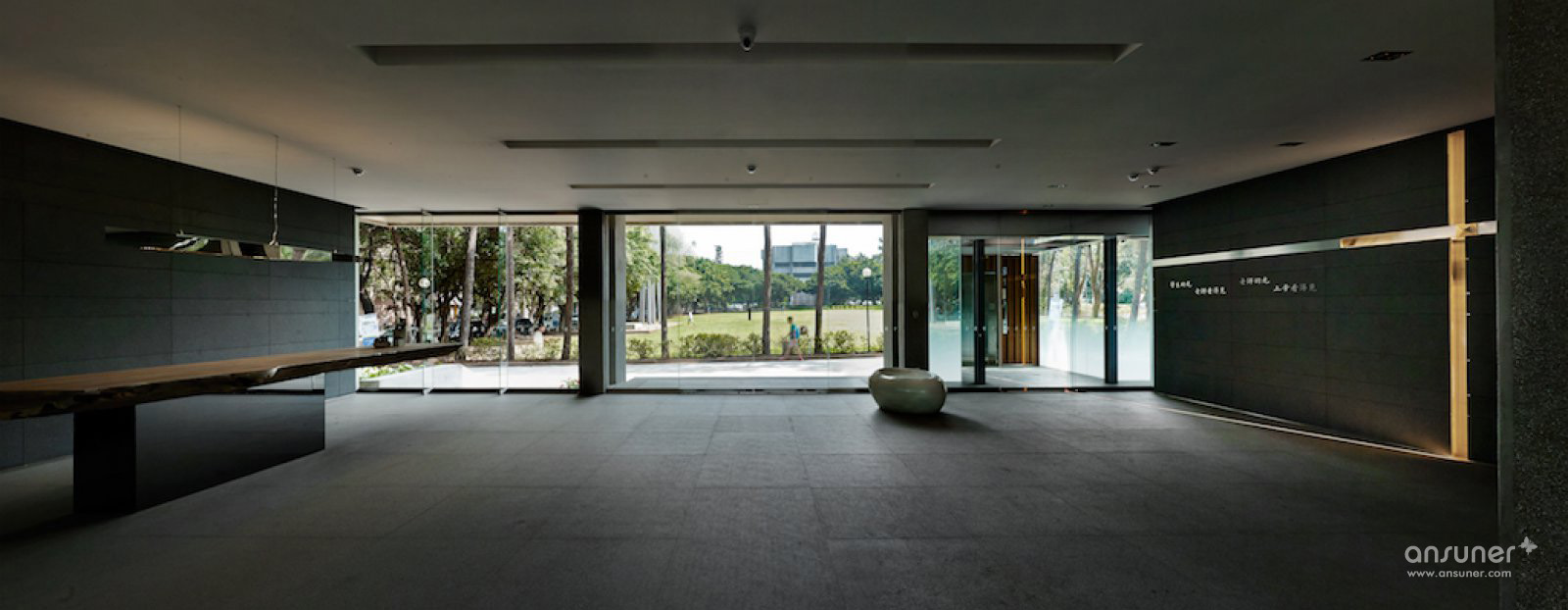拾级而上,厚实的石块墙体同样以15度的斜轴贯穿二、三楼。短轴长轴的概念重现;短轴串起前后的透明电梯及楼梯,是各楼层的动线枢纽;长轴左侧的大会议室与沿着长轴排开的工作空间,紧密而不冲突。 三楼的校长室与副校长室分倨长向轴线的左右两侧,突显其重量。