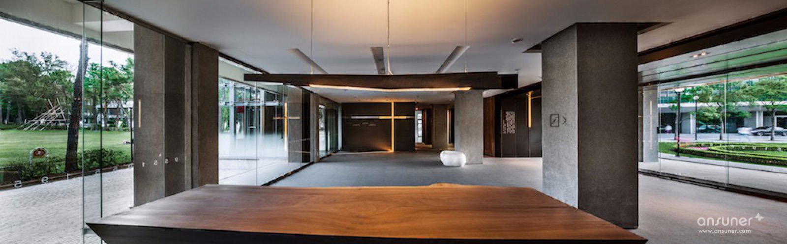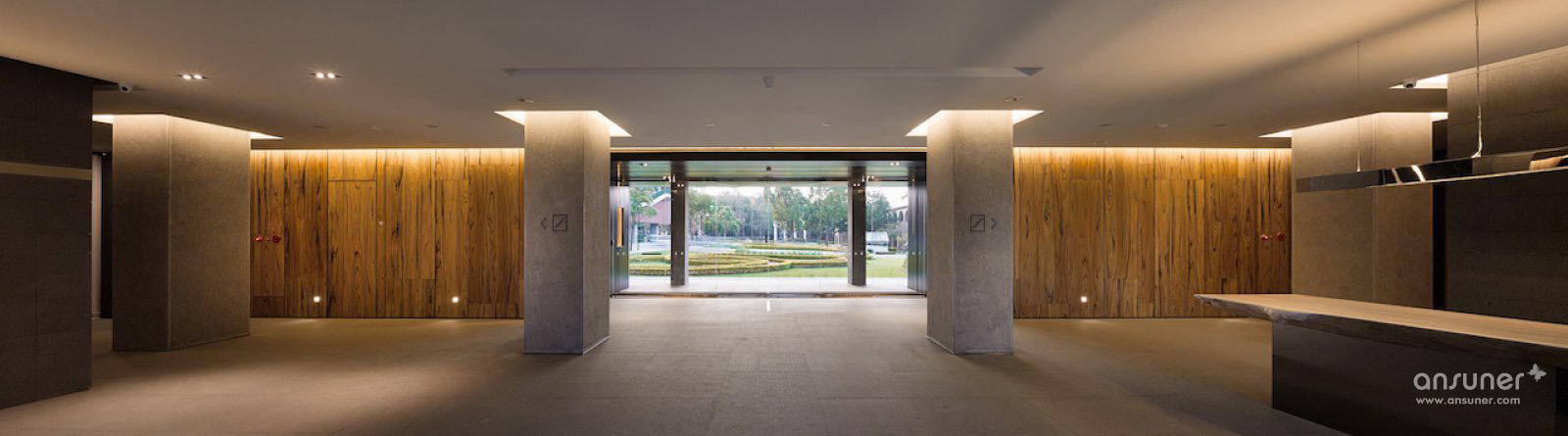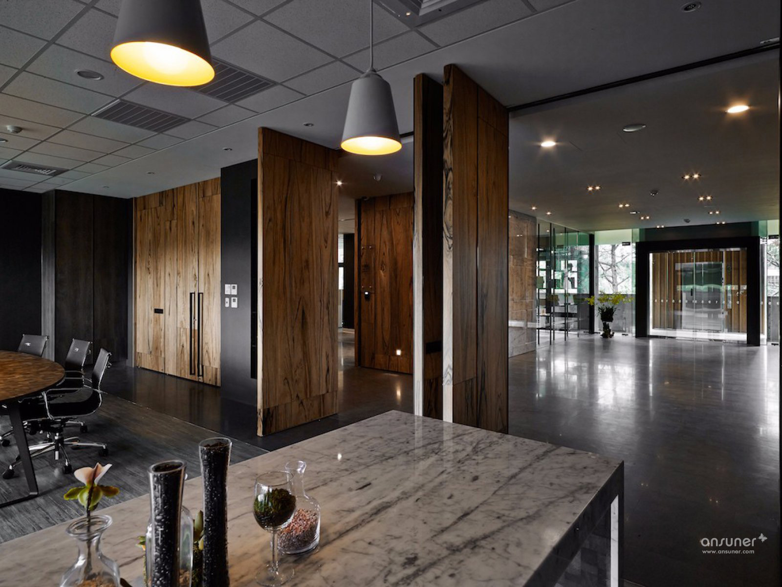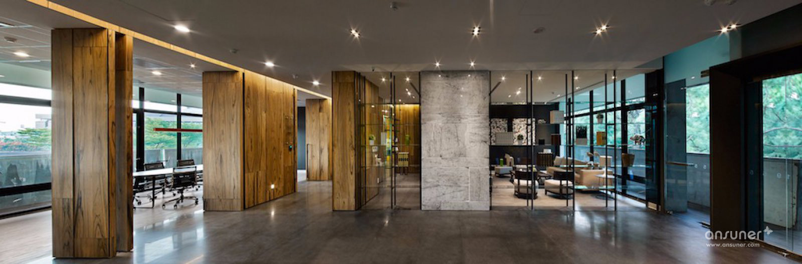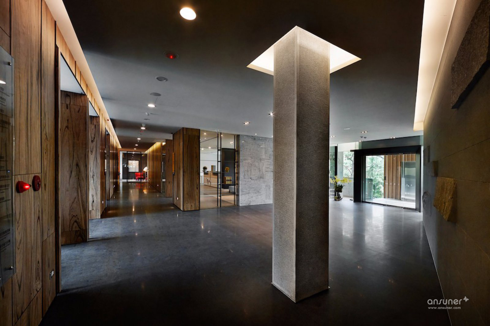 通透的梯厅,多功能的会议室,当门片全部开启时,光线自由篡流,阴霾一扫而空。 柱顶及长廊墙上的间接灯光溢流而下,柱子与墙的边界消失在天花板内。 光,在空间里无声的说话!