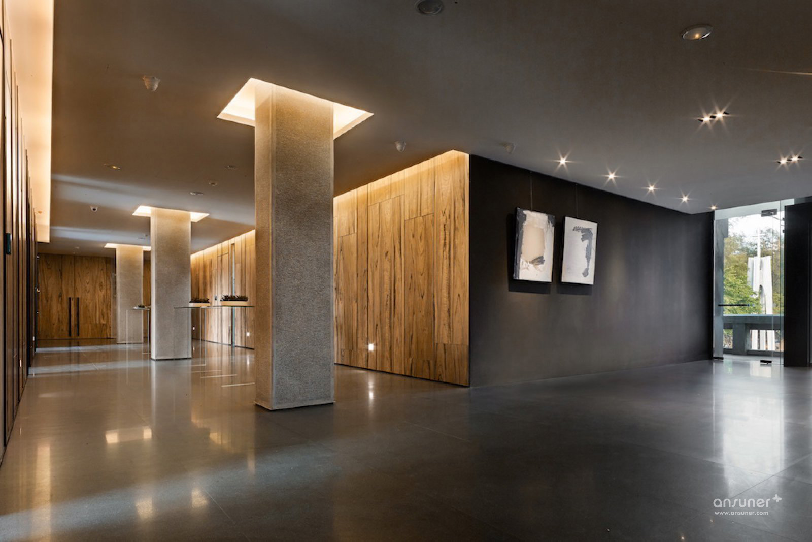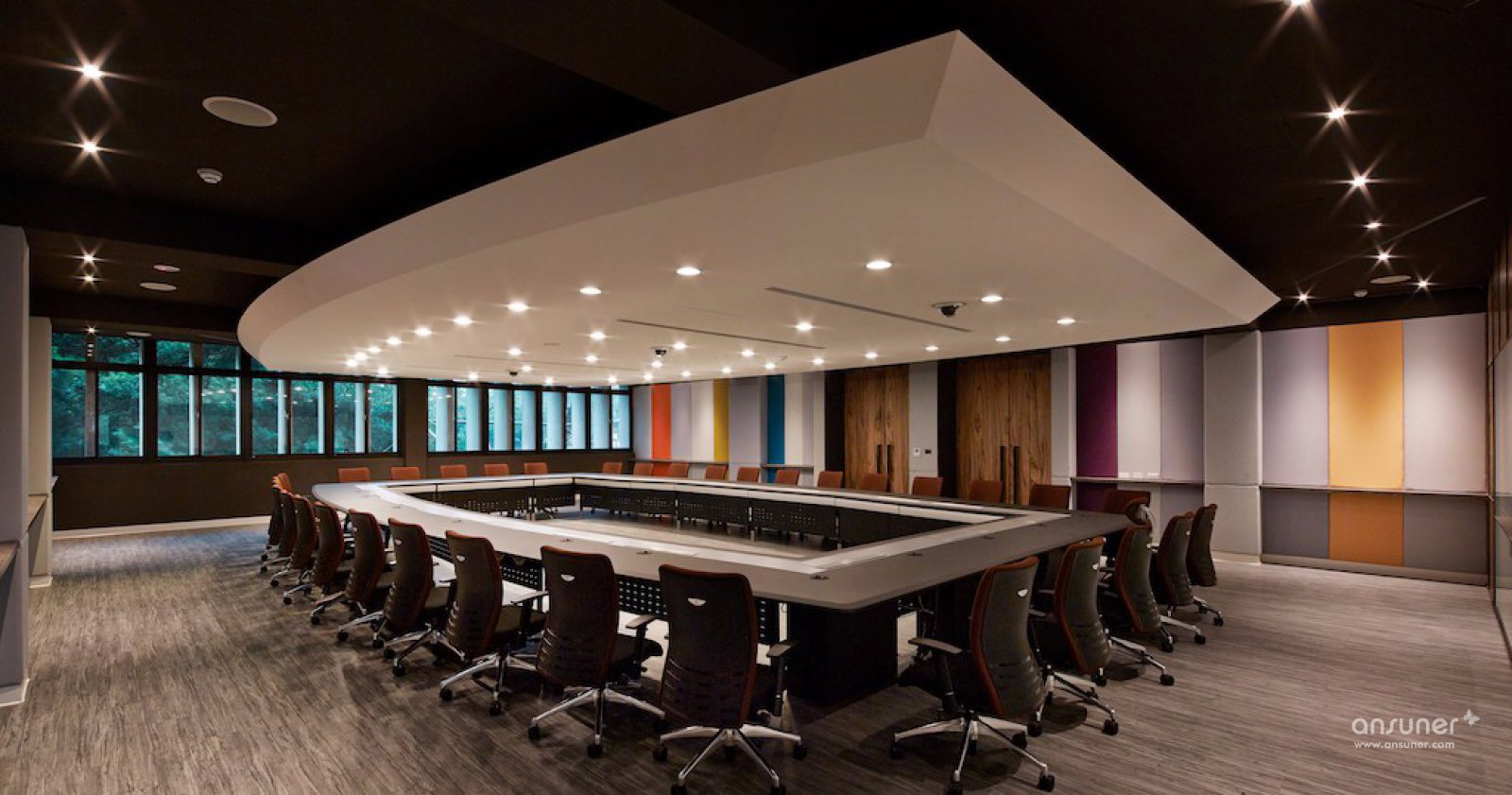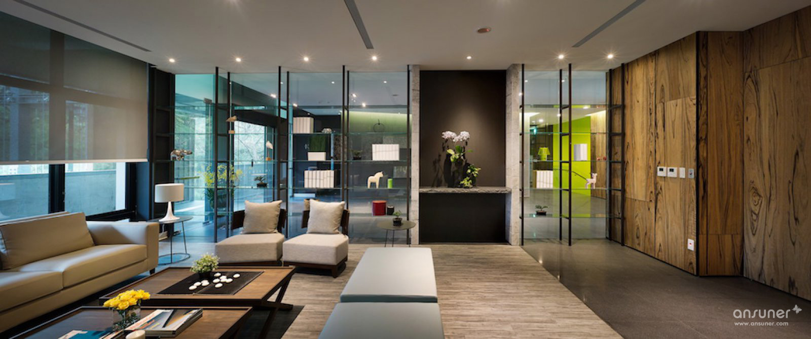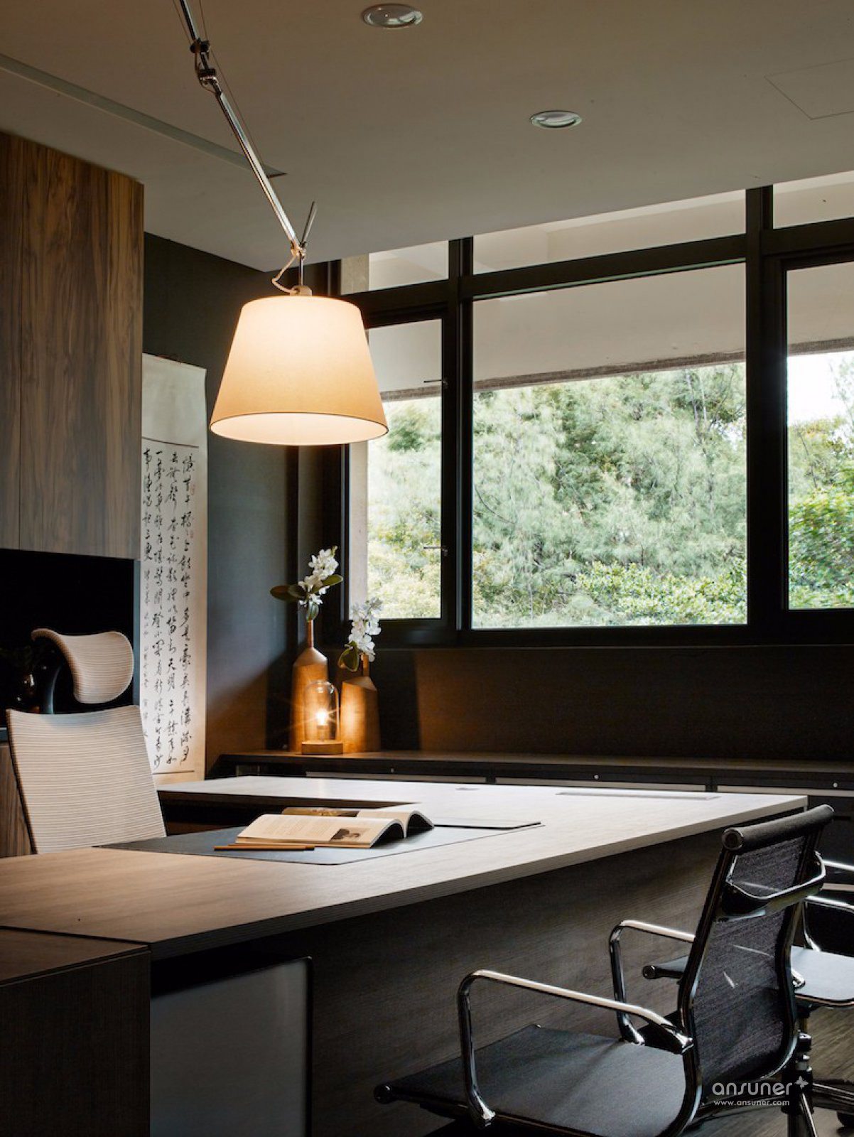 通透的梯厅,多功能的会议室,当门片全部开启时,光线自由篡流,阴霾一扫而空。 柱顶及长廊墙上的间接灯光溢流而下,柱子与墙的边界消失在天花板内。 光,在空间里无声的说话!