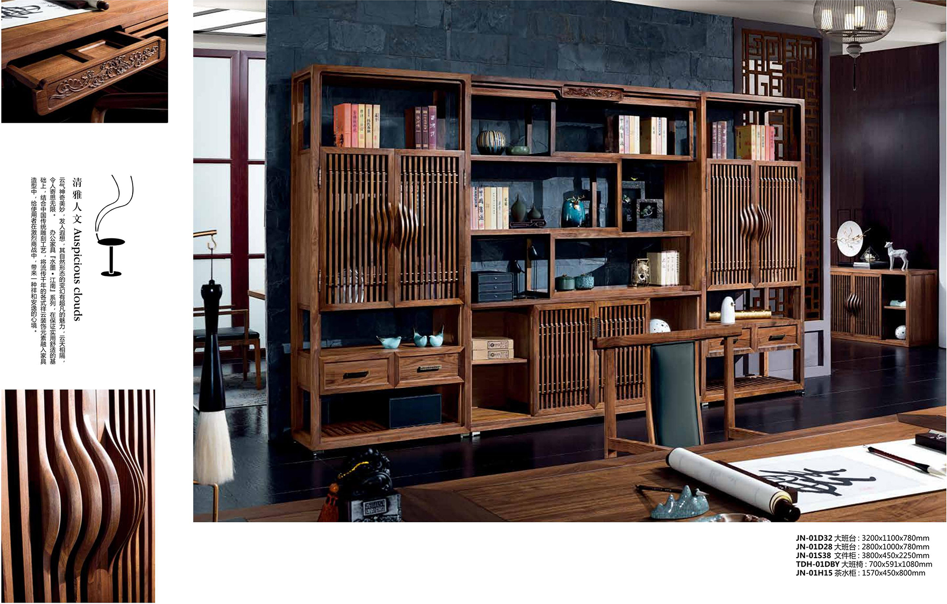 云气神奇美妙“发人遐想 其自然形态的变幻有超凡的魅力“云天相隔,令人寄思无限“办公家具【水墨·江南】系列“在保证实用舒适的基础上“结合中国传统雕刻工艺 将流传千年的各式样云装饰元素融入家具造型中·给使用者在激烈商战中·带来一种祥和安逸的心境。